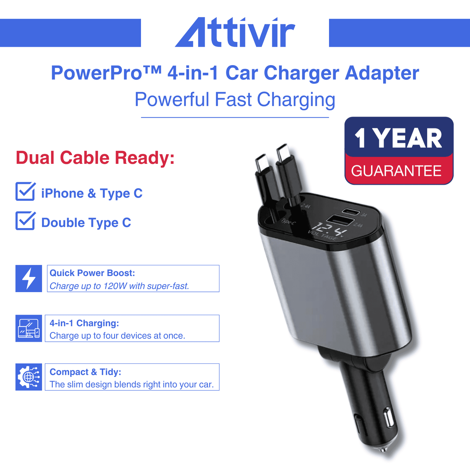 The Attivir® PowerPro™ 4-in-1 Car Charger combines advanced technology with rigorous testing to deliver up to 3 times faster charging and real-time voltage monitoring. Unmatched reliability and convenience make it the ultimate choice for your on-the-go power needs.